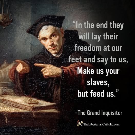 “In the end, they will lay their freedom at our feet and say to us make us your slaves, but feed us.” The Grand Inquisitor in Brothers Karamozov.